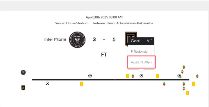 第61分钟梅西分球,阿伦挑射破门,小雷东多头球一蹭。赛后根据美冠杯官网显示,此球计为小雷东多进球,阿伦助攻,因此梅西“痛失一助”。